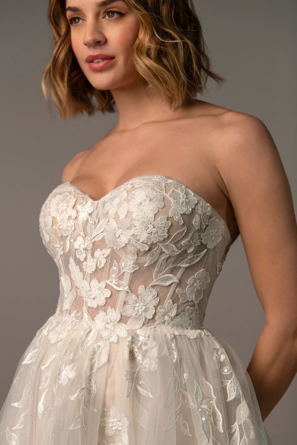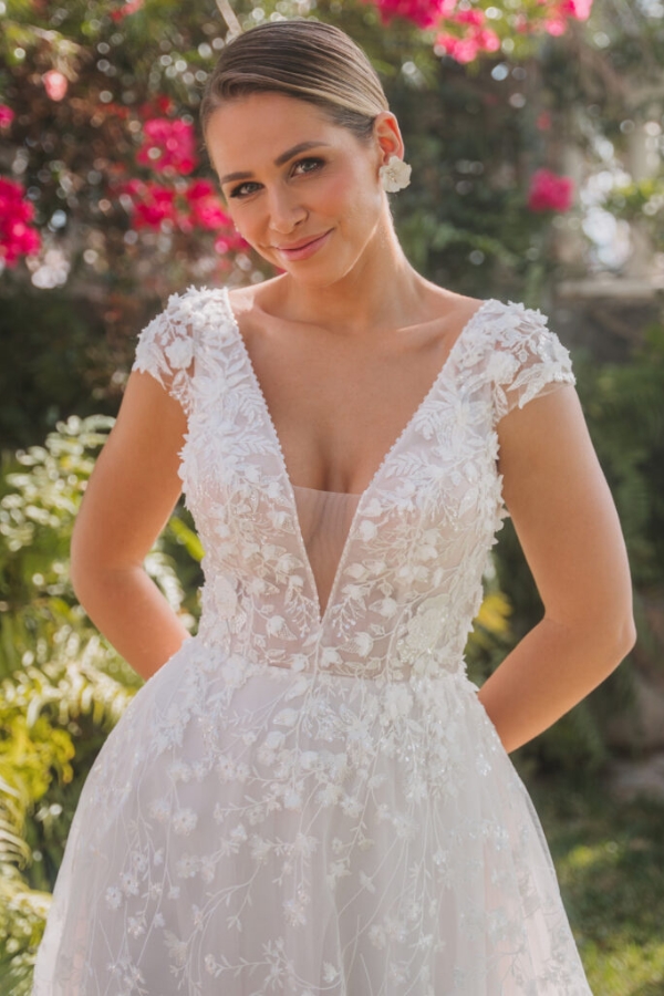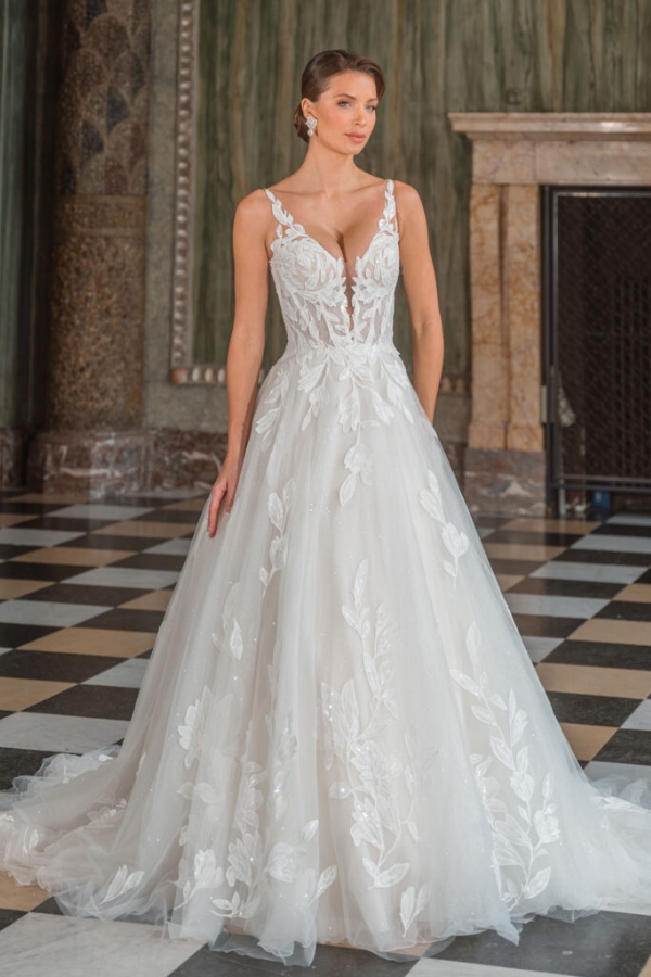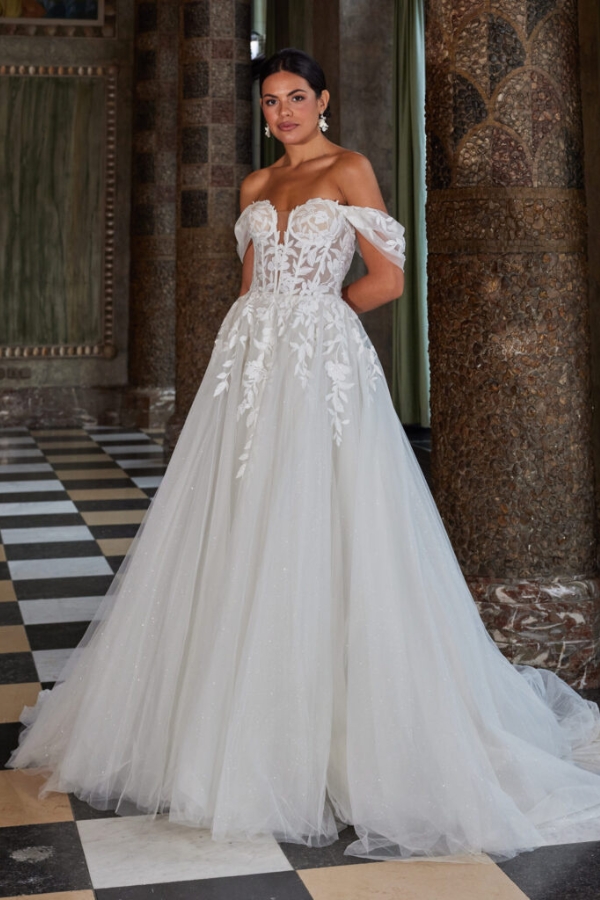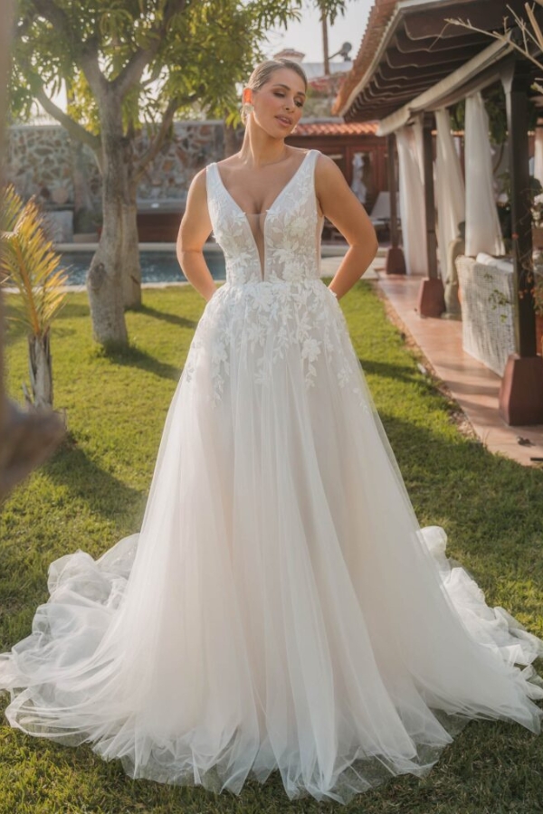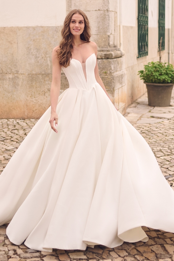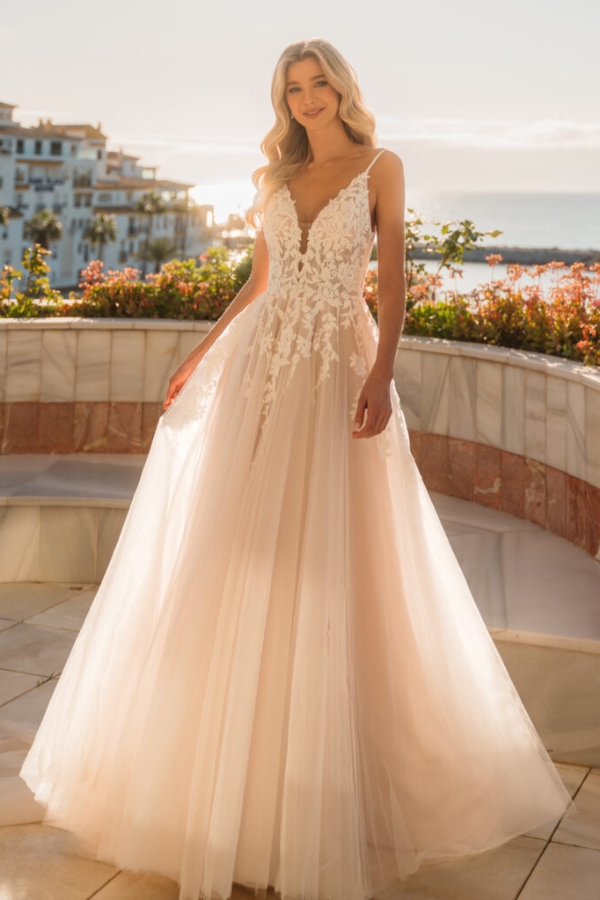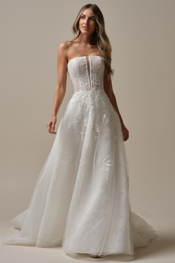 Die A-Linie ist eine der beliebtesten und klassischsten Brautkleidsilhouetten. Sie kennzeichnet sich durch die schöne Betonung der Taille und dem figurschmeichelnden Rock, der in der Form eines großen “A” fällt. Dadurch kaschiert er Hüfte und Oberschenkel und lenkt die Aufmerksamkeit nach oben zur Braut. Die Silhouette ermöglicht sowohl eine weite A-Linie für extra viel Volumen als auch eine leichte A-Linie für alle Bräute, die es schlicht mögen.