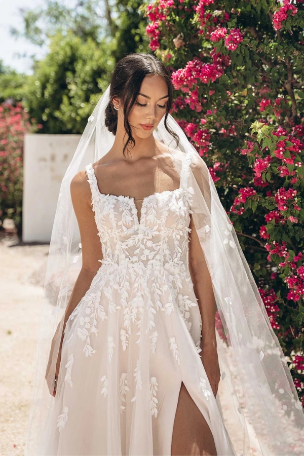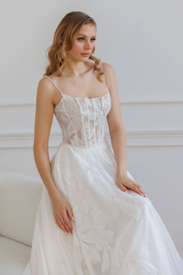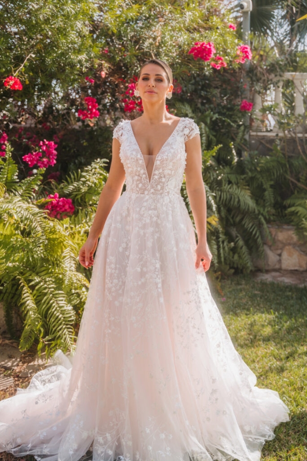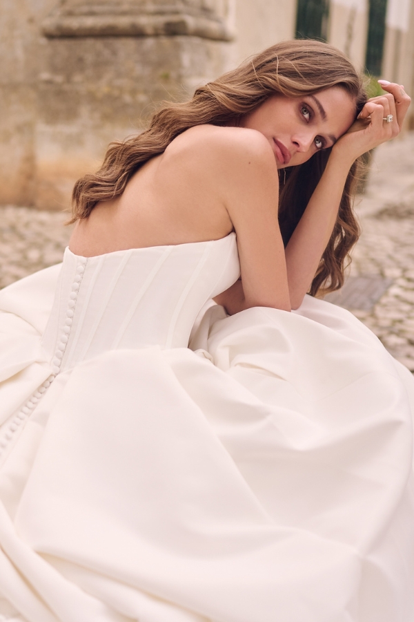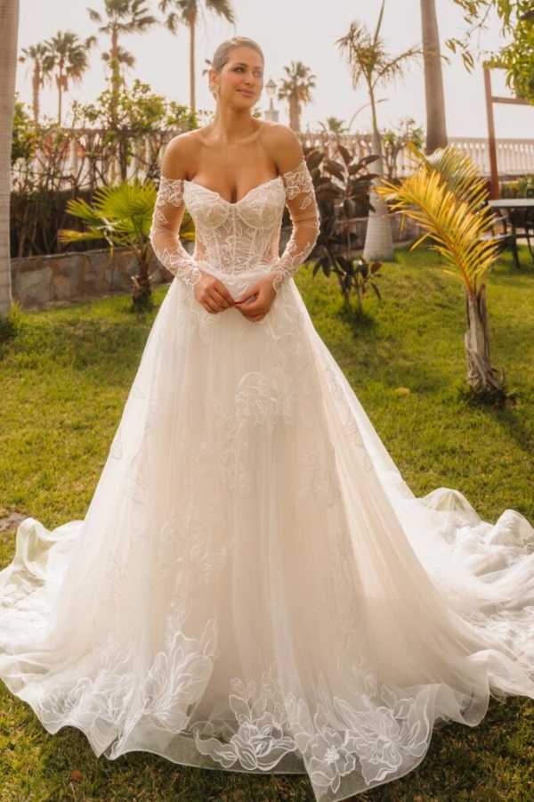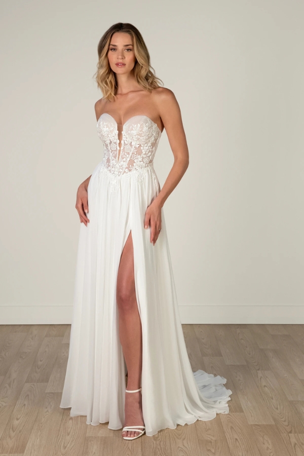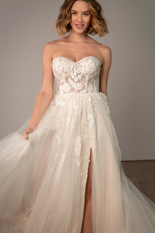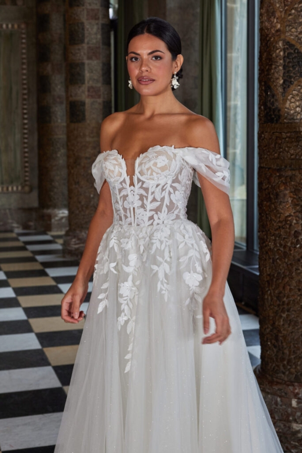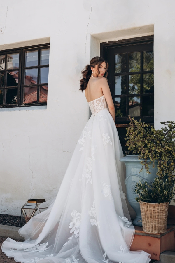 Die A-Linie ist eine der beliebtesten und klassischsten Brautkleidsilhouetten. Sie kennzeichnet sich durch die schöne Betonung der Taille und dem figurschmeichelnden Rock, der in der Form eines großen “A” fällt. Dadurch kaschiert er Hüfte und Oberschenkel und lenkt die Aufmerksamkeit nach oben zur Braut. Die Silhouette ermöglicht sowohl eine weite A-Linie für extra viel Volumen als auch eine leichte A-Linie für alle Bräute, die es schlicht mögen.
